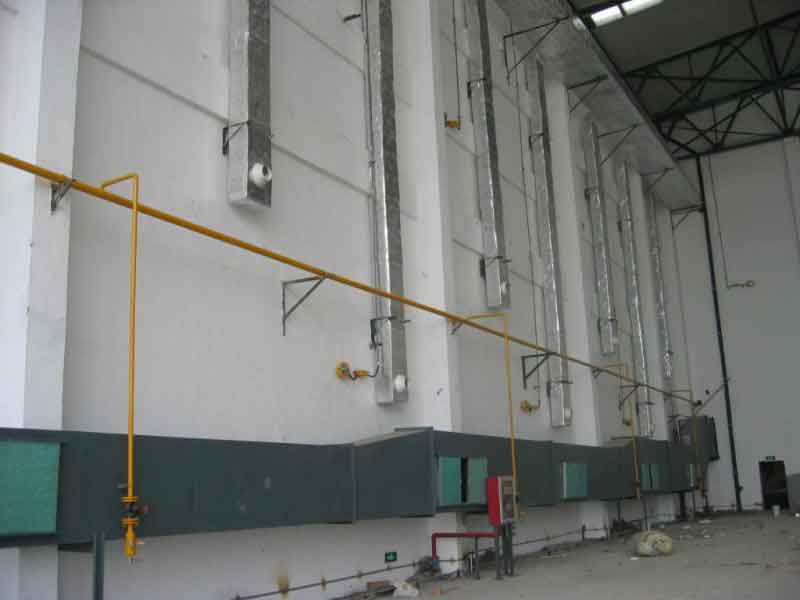 塗裝房 塗裝車間采用車庫式工藝流程,工件由液壓自升式平板車運輸,運輸至固定工位。平板車的平台(tái)自動下降到工件腳手架,然後平板車退出,或者電(diàn)動平板車將工件運送到指定位置。